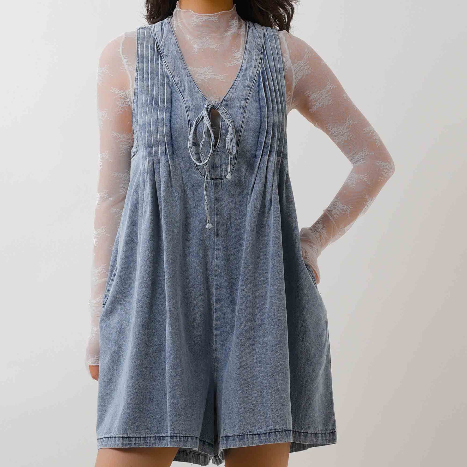 Women's Denim Romper - Sleeveless V-Neck Jumpsuit with Tie Front & Pockets Cherie Code