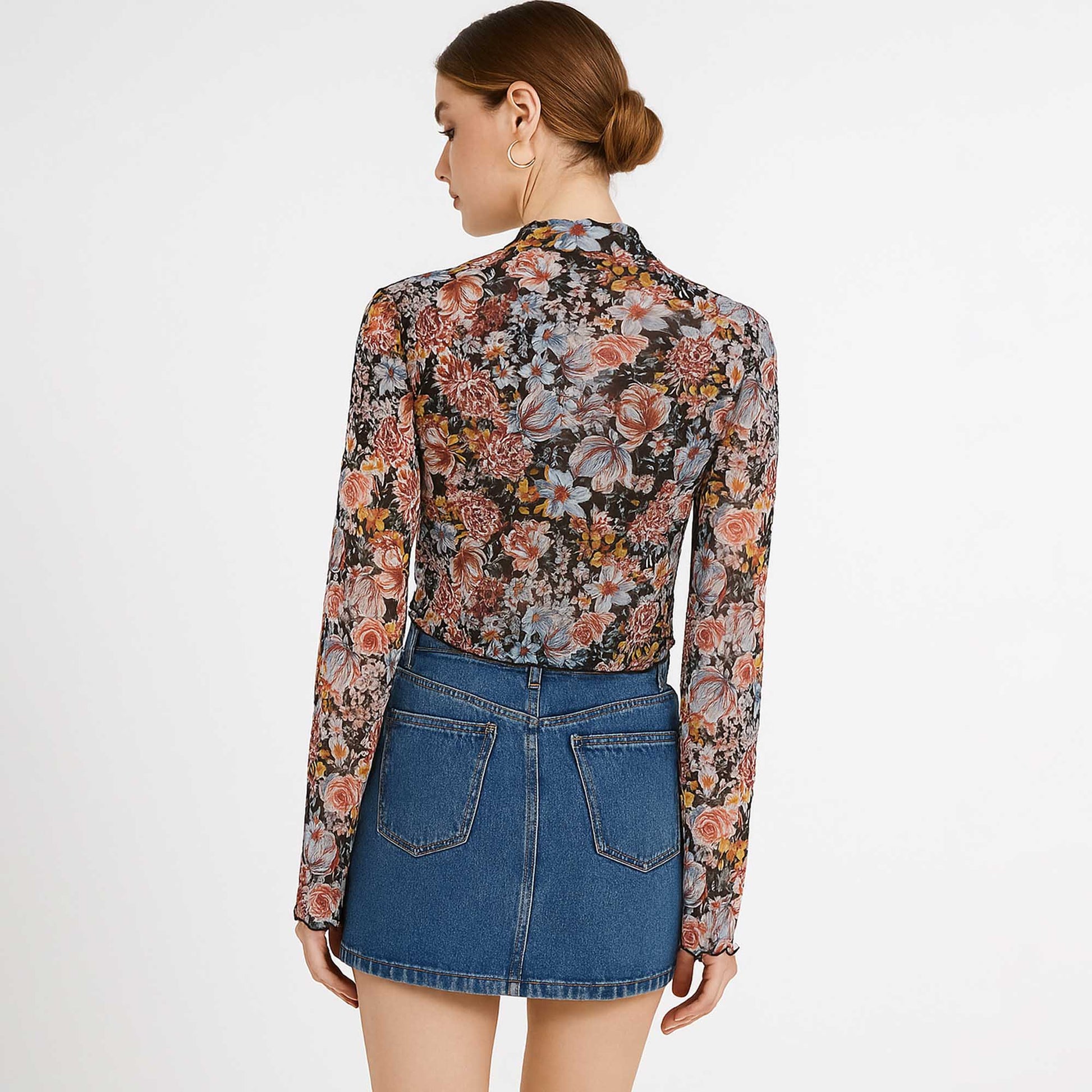 Women's Floral Mesh Long Sleeve Crop Top – Sheer Stretchy Slim Fit Turtleneck Pullover for Layering by Cherie Code